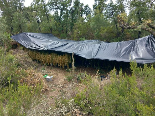 Seguidament, els agents van obrir la bossa negra que havia estat deixada al voral i van trobar unes tisores de podar, bosses d’escombraries i menjar. A partir d’aquesta troballa, es va iniciar una recerca per la zona boscosa propera on es va localitzar una plantació de marihuana amb 450 plantes i unes altres 600 plantes tallades i en procés d’assecament.